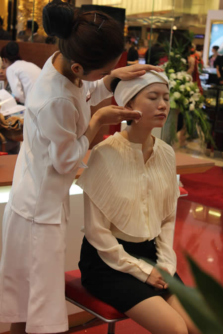 嬌韻詩專柜導(dǎo)購用專業(yè)手法為顧客現(xiàn)場做植物精華護(hù)理