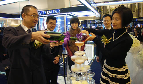 雙方領(lǐng)導共同為慶祝雅詩蘭黛盛裝入駐蘭州國芳百貨倒入香檳