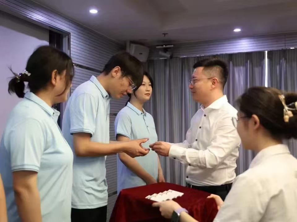 伴隨著激昂的音樂,入職儀式進入了發(fā)放工牌的環(huán)節(jié)。國芳集團各位領導面帶微笑,將蘊含著公司信任與期望的工牌并伴手禮交到新員工手上,工牌在燈光的照耀下,折射出他們堅定的信念和對新征程的信心。