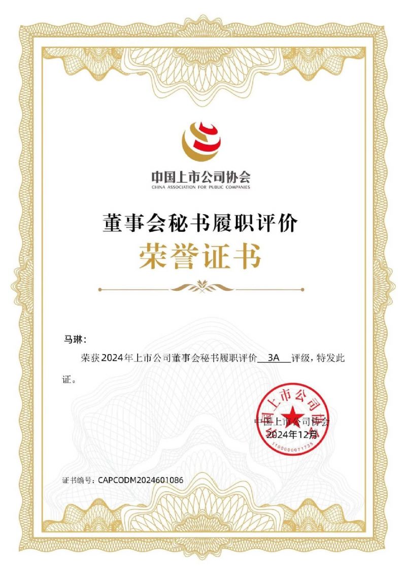 中上協(xié)發(fā)布丨公司榮獲“2024上市公司董事會(huì)秘書履職評價(jià)”3A評級
